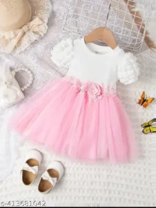 Add a touch of charm to your little one’s wardrobe with this adorable Pink & White Party Wear Frock. Made with soft and breathable fabric, it keeps your baby girl comfortable all day long. The fluffy net skirt and floral lace belt add a cute princess look — perfect for birthdays, family gatherings, or photoshoots